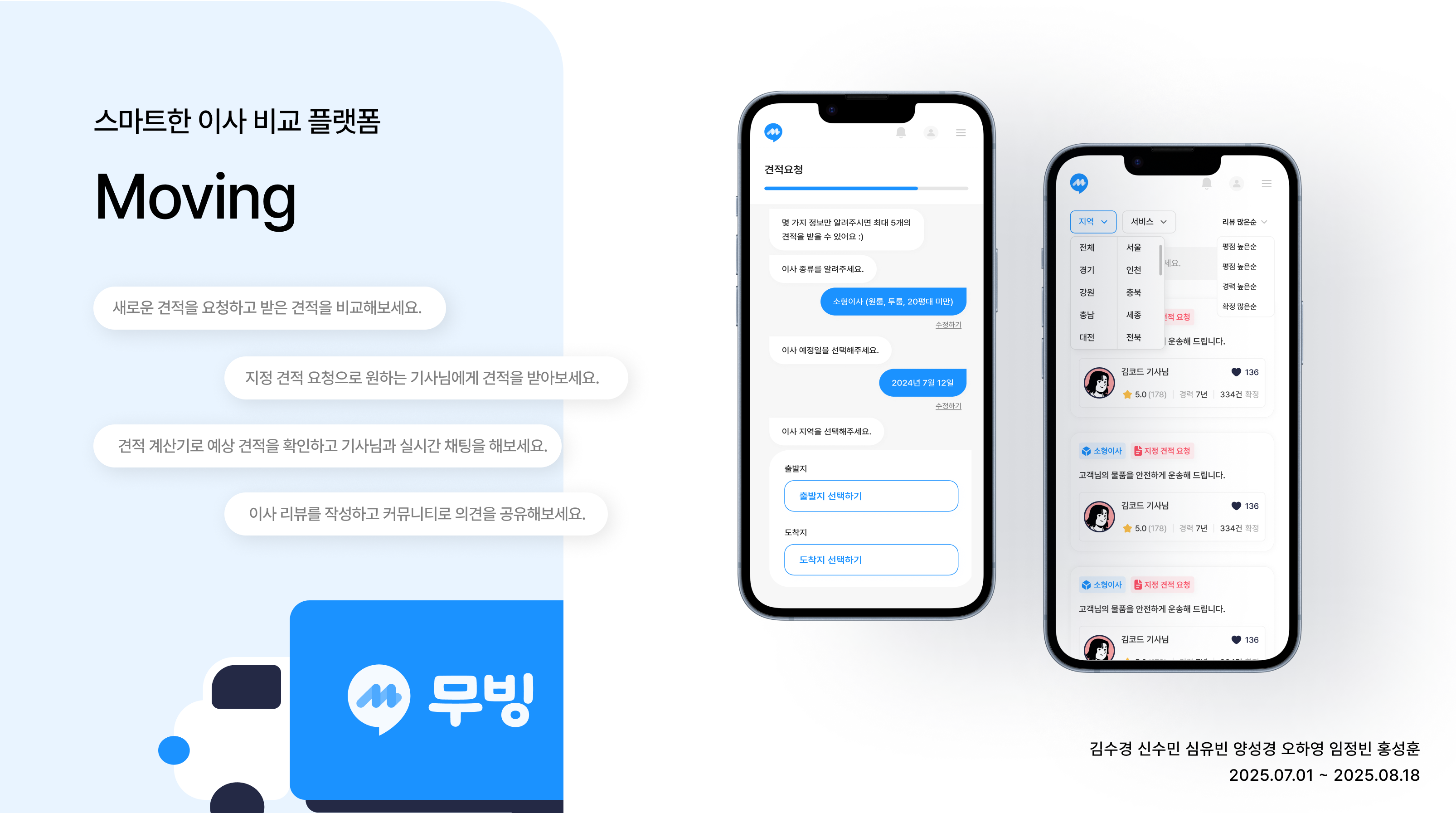 기존의 복잡하고 불투명했던 이사 견적 과정을 간소화하여, 사용자가 원하는 조건(이사 유형, 지역, 일정 등)에 맞는 전문가를 빠르게 찾을 수 있습니다.